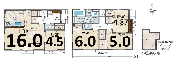 | 設備 | 公営水道、公共下水、外壁サイディング、閑静な住宅地、角地、地盤調査済、南側道路面す、2沿線以上利用可、システムキッチン、カウンタキッチン、追い焚き、浴室乾燥機、トイレ2ヶ所、浴室1坪以上、浴室に窓、南面バルコニー、2階建、LDK18畳以上、採光3面、床下収納、フラット35Sに対応、モニタ付きインターフォン、複層ガラス、通風良好、陽当り良好 |
